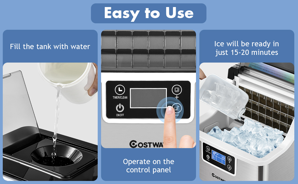 - Smarter 24H Timer & Self-Cleaning - Press the "CLEAN" button for more than 5 seconds to enter 20 minutes of thorough self-cleaning. Featuring a 24H timer, the self-cleaning ice maker can be set to stop before midnight and restart the next morning by the timer function. When you wake up in the morning or get home from work in the evening, You can get a lot of ice from the ice machine immediately. A clear indicator on the LCD screen for ice full and water shortage reminds us.